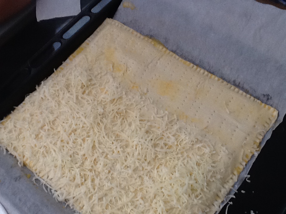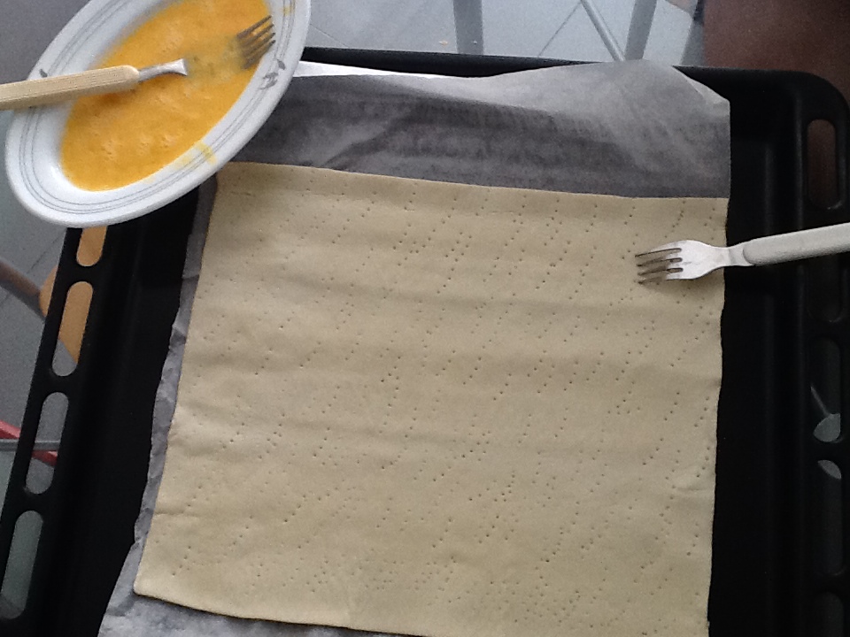 Mientras batimos el huevo y extendemos una de las masas en la bandeja del horno.