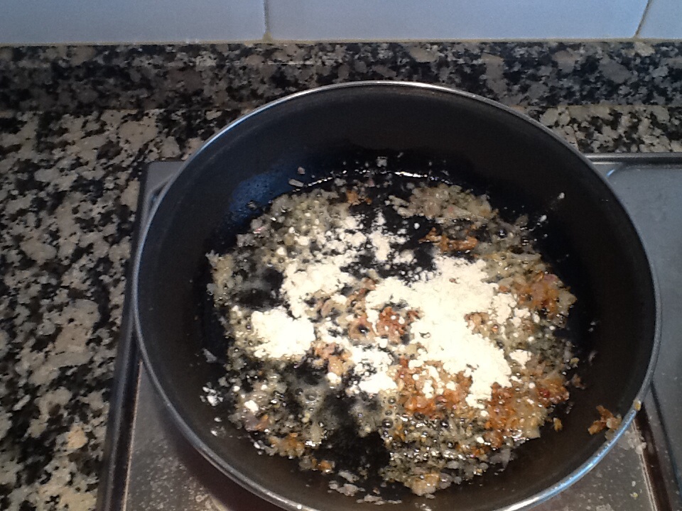 Rallar y sofreír una cebolla mediana. Una vez dorada añadir la harina y remover.