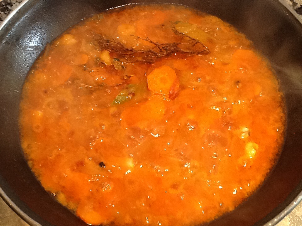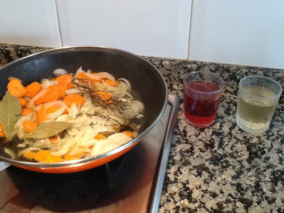 Llevar a ebullición durante unos 5 minutos (fuego suave) para dejar evaporar el vino y se junten todos los aromas. Ir removiendo la mezcla y rectificar de sal.