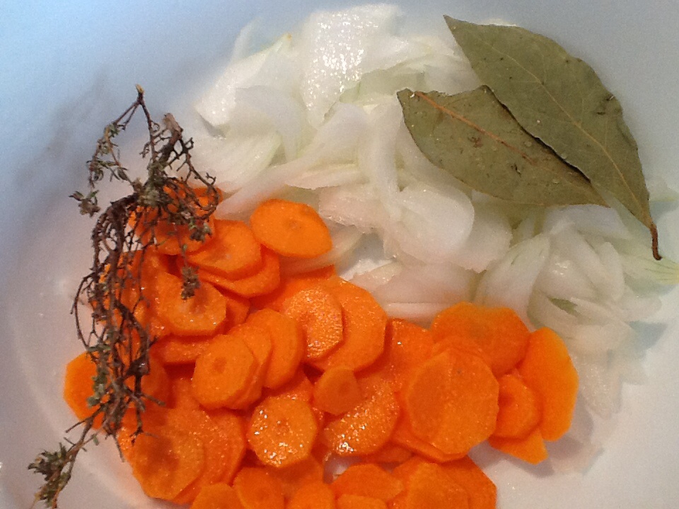 Una vez tengas caliente el aceite incorpora a la sartén la cebolla, la zanahoria, las dos hojas de laurel y el tomillo.