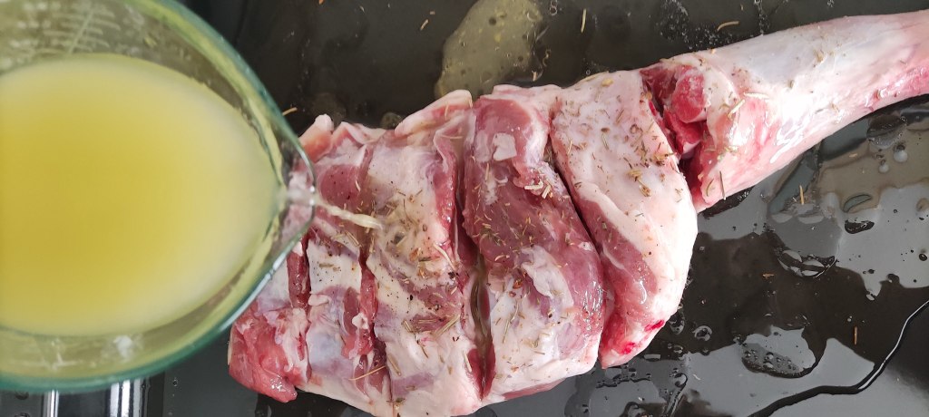 Coloca la carne en la bandeja, rocía con un vasito de vino blanco y otro de caldo o agua. Rocia el cordero con aceite. Métela al horno unos 15 minutos por cada lado para sellar. El horno encendido arriba y abajo. Recomiendo seguir las instrucciones de tu horno para cocinar piezas grandes.