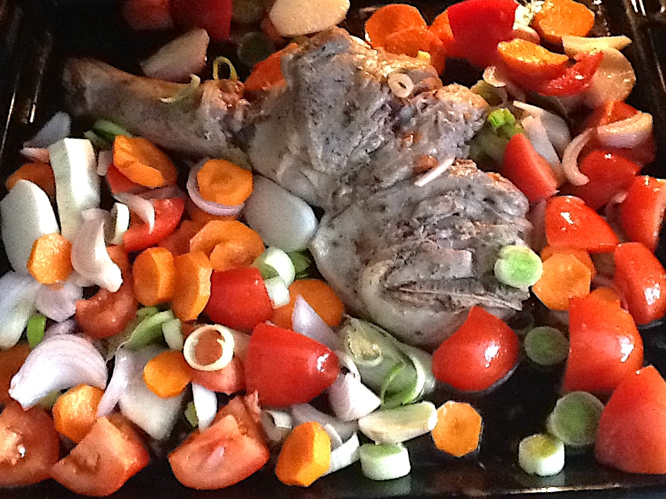 Mantenemos en el horno unos 20 minutos, giramos la espalda de cordero, removemos y añadimos las patatas.