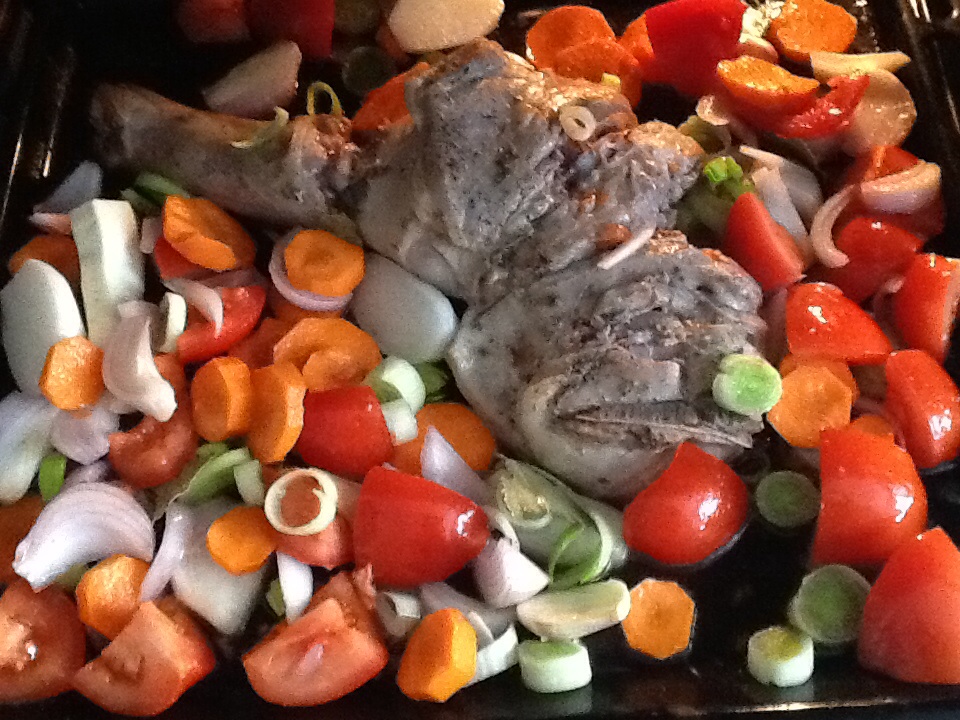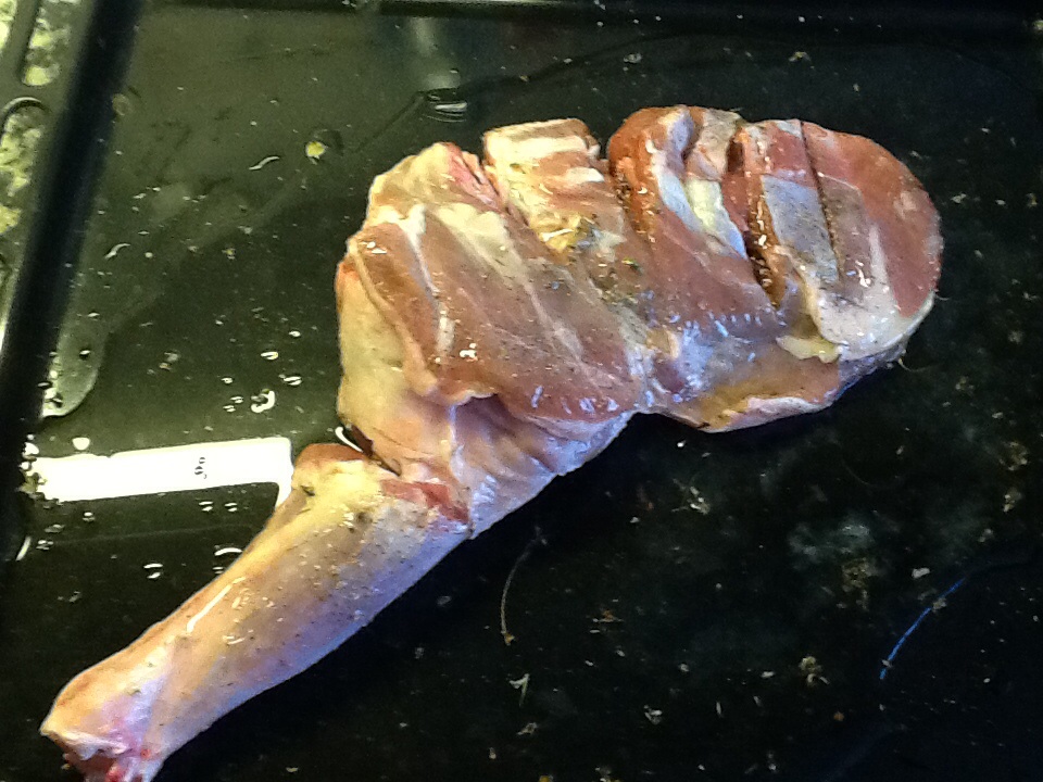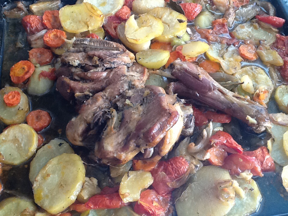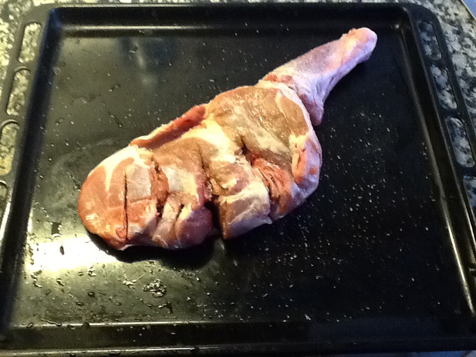 Introducimos la espalda de cordero en el horno rociada por un vasito de vino blanco y un vaso de agua. La mantenemos un cuarto de hora por cada lado en el horno.
