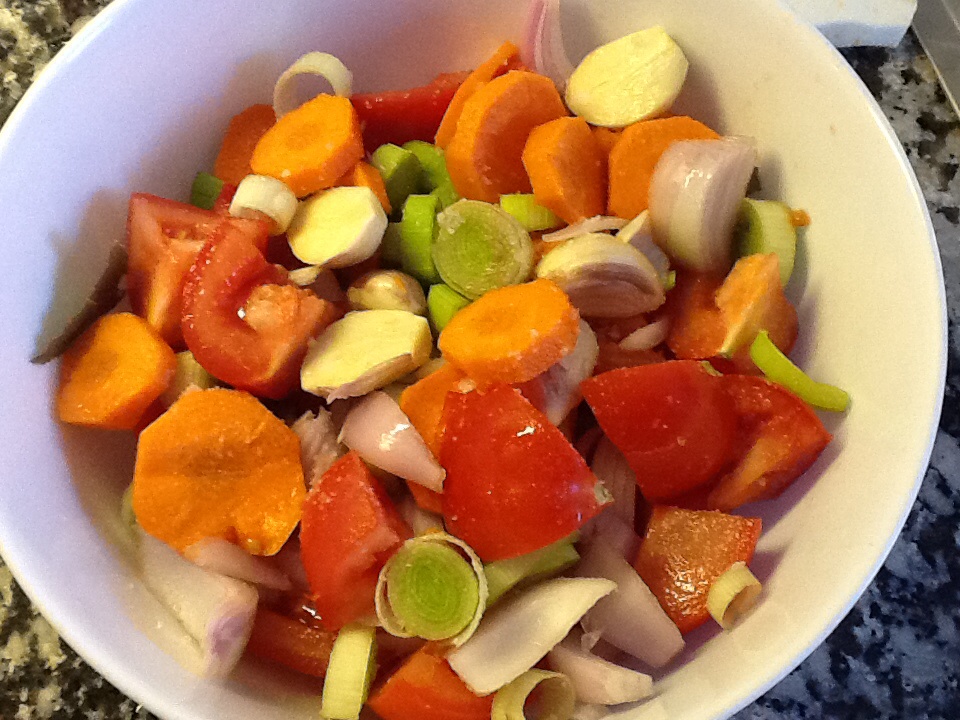 Cortar las verduritas, cebolla, puerro, tomates y zanahorias.