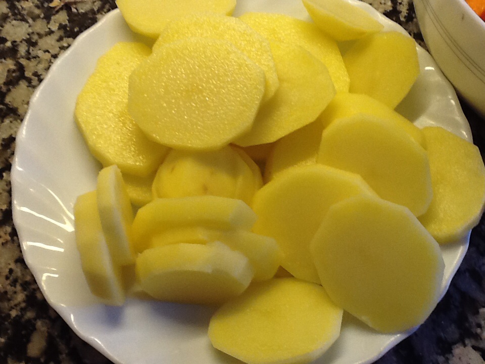 Pelar las patatas y cortarlas a rodajas a medio centímetro aproximadamente, salar y reservar.