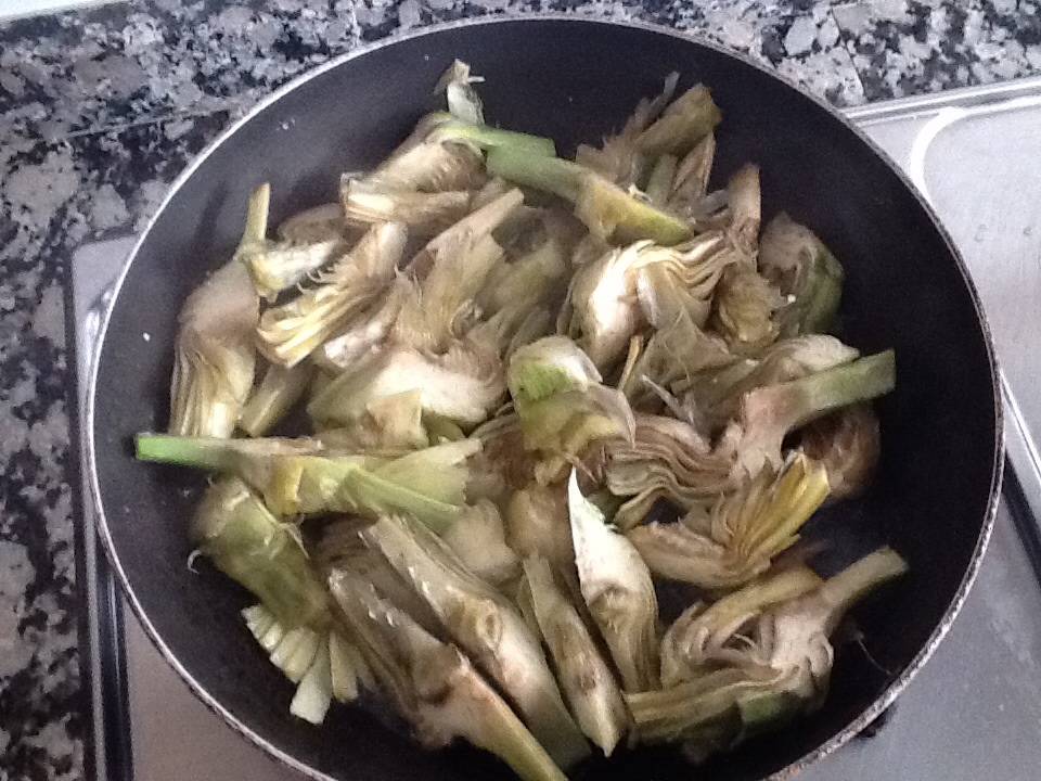 Mientras, podemos freír unas alcachofas para acompañar el plato.