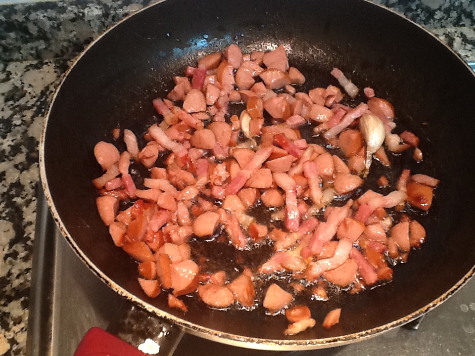 freír los taquitos de beicon y el frankfurt cortado a trocitos con un poquito de aceite y un ajo que antes de añadir el arroz retiras.