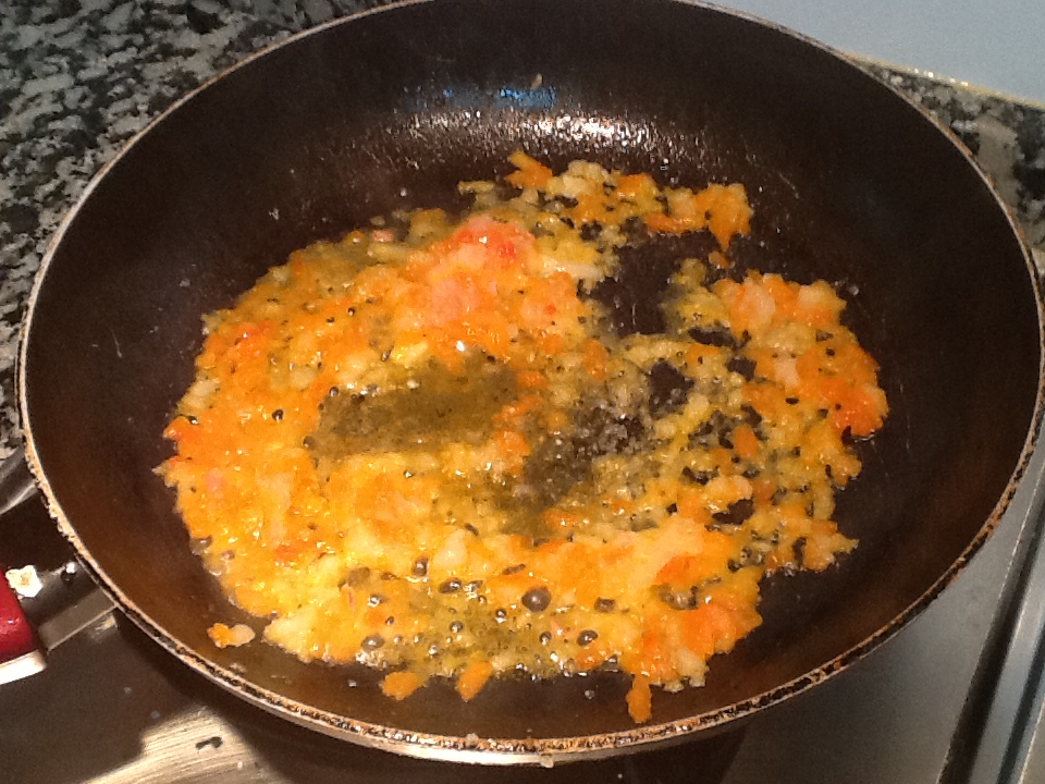 Ralla una cebolla pequeña y un trozo de pimiento rojo. Sofríe en un poco de aceite.