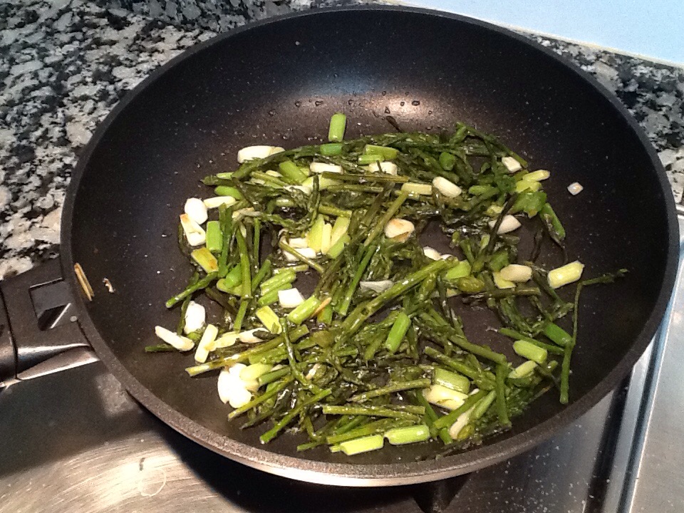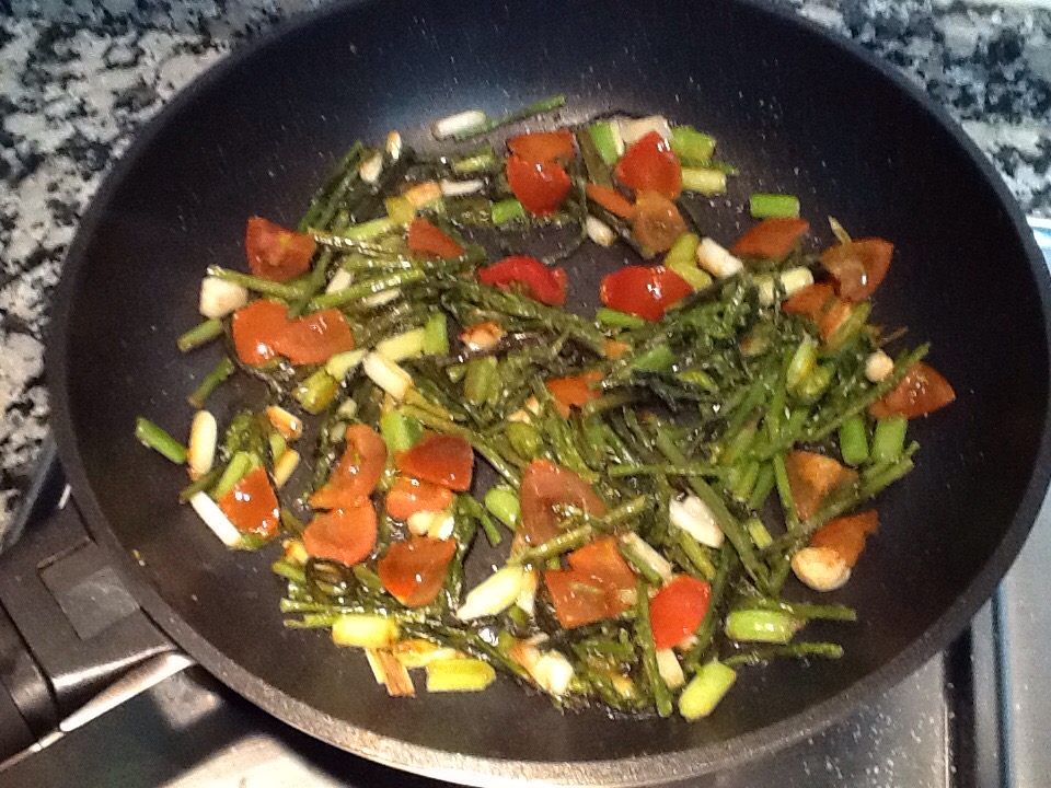 – Pongo a calentar un poco de aceite en una sartén y añado los espárragos y los ajos.