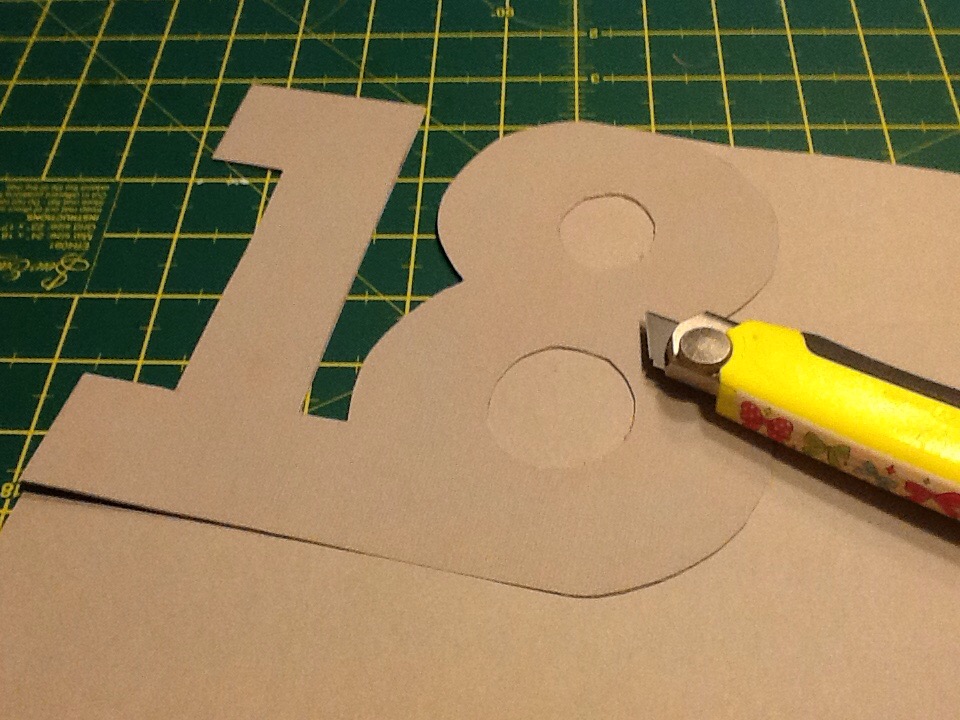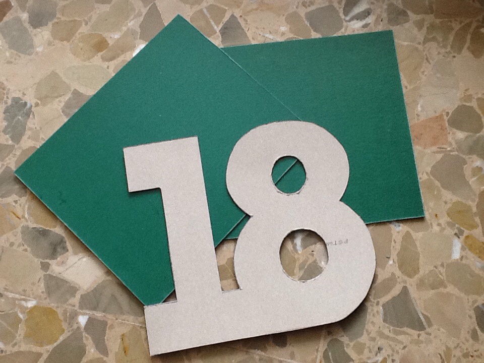 Empecé diseñando el número 18 en Word , alargando los extremos del 1. Corté las tapas y el número en cartón que después forré con papel scrap.