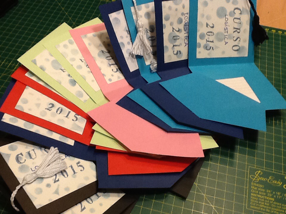 Vamos a ver como hice la tarjeta/birrete en cartulina, borla y en el interior un bolsillo para introducir una hoja de papel con los mails de todos los alumnos.