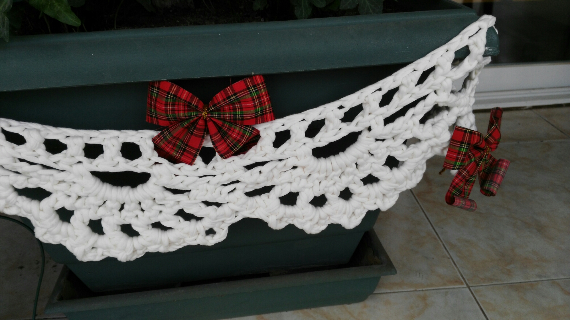 Y ….. en invierno he aprovechado la puntilla para adornar la maceta de mi árbol reciclado de navidad.