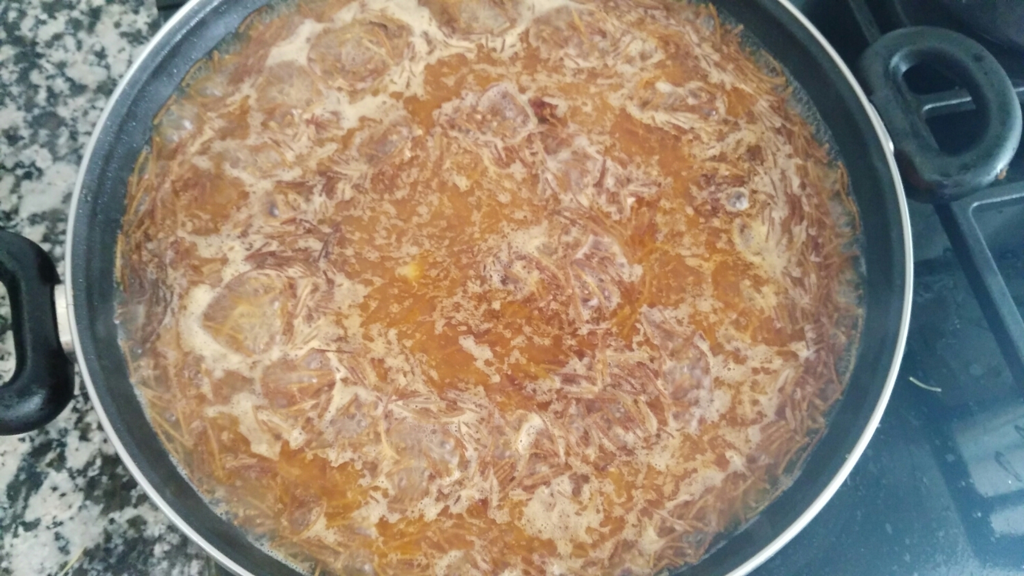 Una vez tostados los fideos , añadir el caldo de pescado bien caliente. Tiene que cubrirlos.
