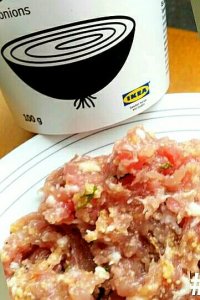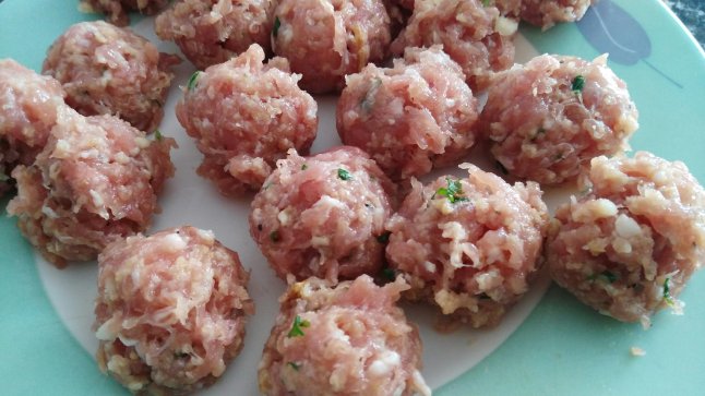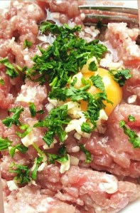 Empezamos preparando la masa con … la carne de pavo, el huevo, perejil y ajo troceado, un poco de pan rallado, la cebolla frita y sal.