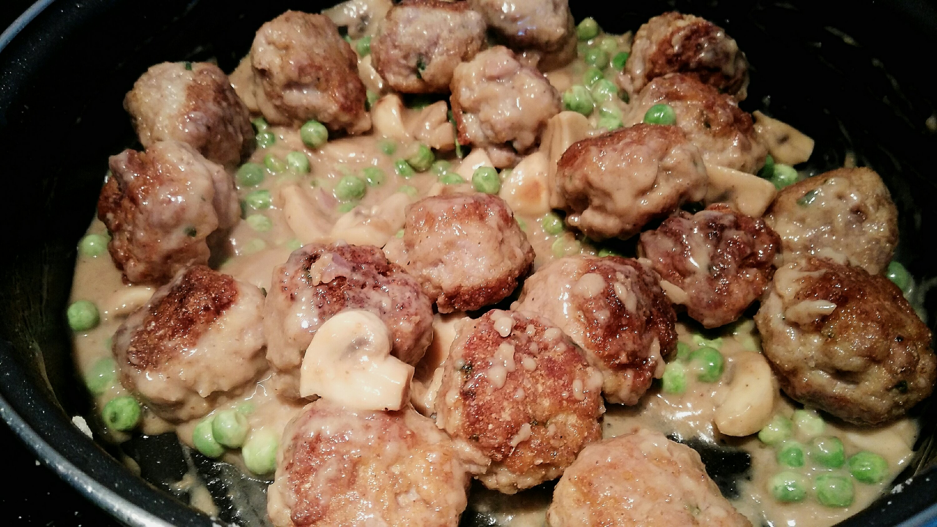 Incorpora las albóndigas y los guisantes. Remueve y cubrelas con caldo. Dejar cocer 15 minutos a fuego suave.