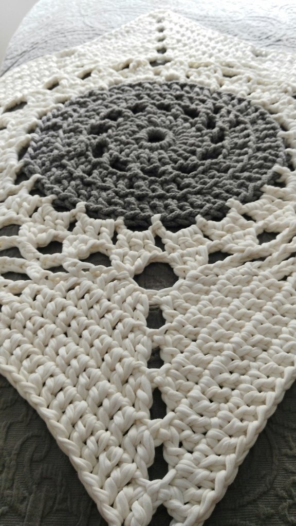 Hola !!! ¿como va todo?. A ver si os gusta este nuevo patrón para una alfombra o …. bueno … yo he acabado poniendola encima la cama como adorno.