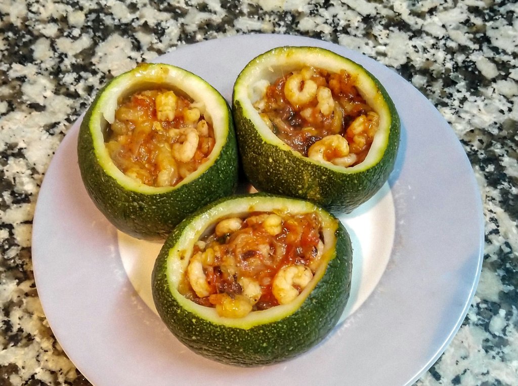 Una vez cocidos, dejar escurrir y enfriar. Cortar la parte superior del calabacín. Con la ayuda de una cuchara variar el interior y reservar. Mientras calienta un poco de aceite en la sartén y haz un sofrito de cebolla y tomate. trascurridos unos minutos añade las gambas, remueve y añade una guindilla si te gusta picantito. Pasados unos minutos añade la pulpa de calabacín que habíamos retirado.
