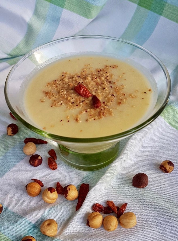 Una vez hervida trituramos las verduras, ajustamos la cantidad de agua al gusto para tener la textura deseada y y a tenemos la crema de coliflor lista para comer. Si la quieres caliente es el momento de picar unas avellanas y servir. Si no, reserva en el frigorífico y en el momento se servir acompañala con el picadillo de avellanas. Puedes darle un toque picante friendo en un poco de aceite una guindilla y añades una cucharadita de este aceite a la crema, eso ya a gustos.