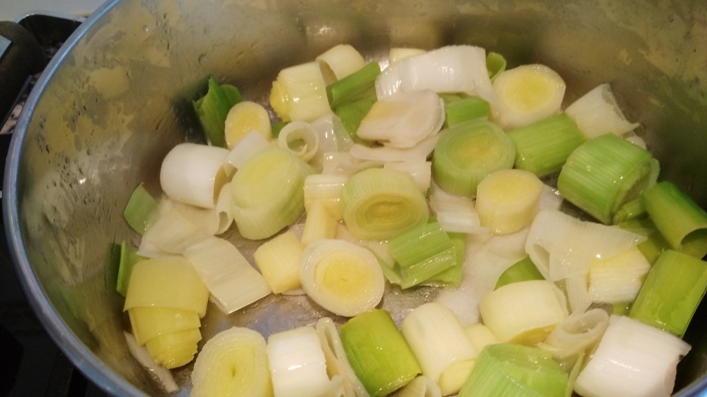 Las hojas más verdes de la coliflor y los puerros los cortamos y reservamos para hacer en algún otro momento un caldo vegetal. Las puedes congelar.