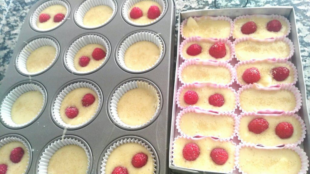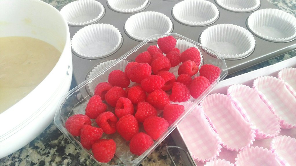 Reparte la masa en las cápsulas para magdalenas e incorpora las frambuesas.