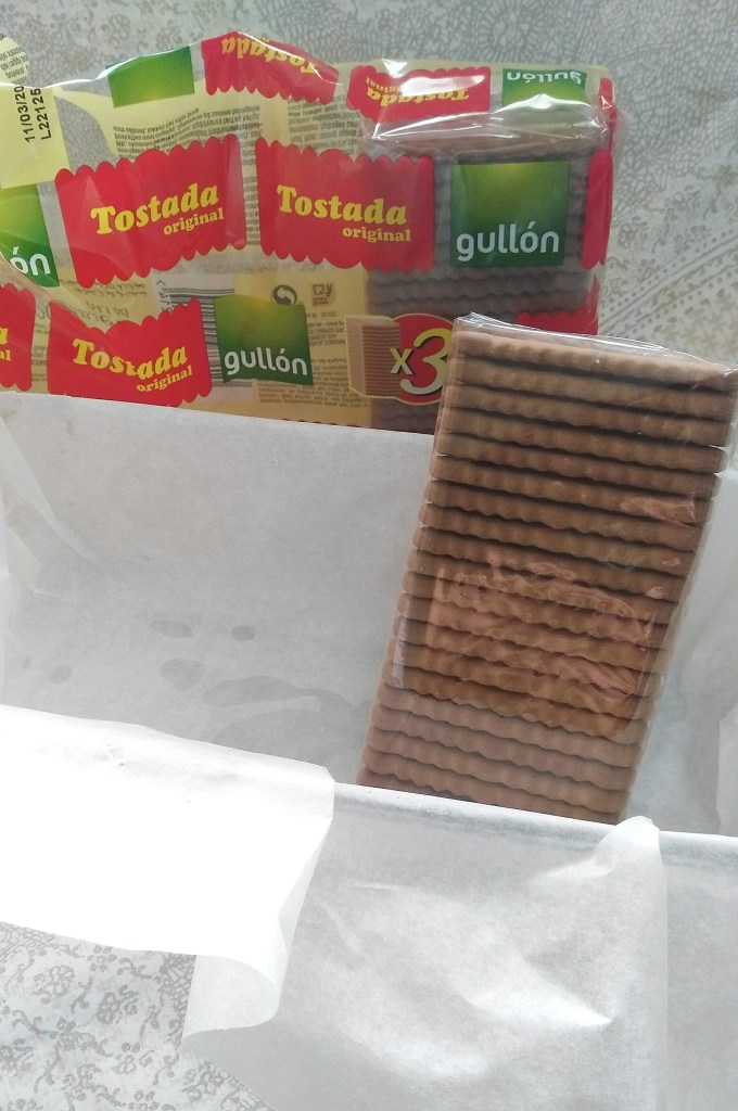 En un molde forrado con papel vegetal voy colocando las galletas untadas ligeramente en leche, he intercalo una capa de chocolate y otra de galletas ….