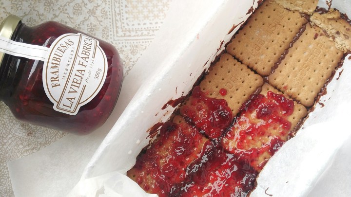 En la siguiente capa las galletas las coloco invertidas a la fila anterior (vertical y horizontal, y unto la siguiente capa de mermelada de frambuesa.