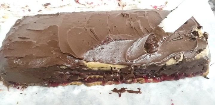 Coloco el pastel de galletas en el frigorífico un par de horas. Desmoldo y giro el pastel. Vuelvo hacer chocolate para cubrir todo el pastel y los laterales.