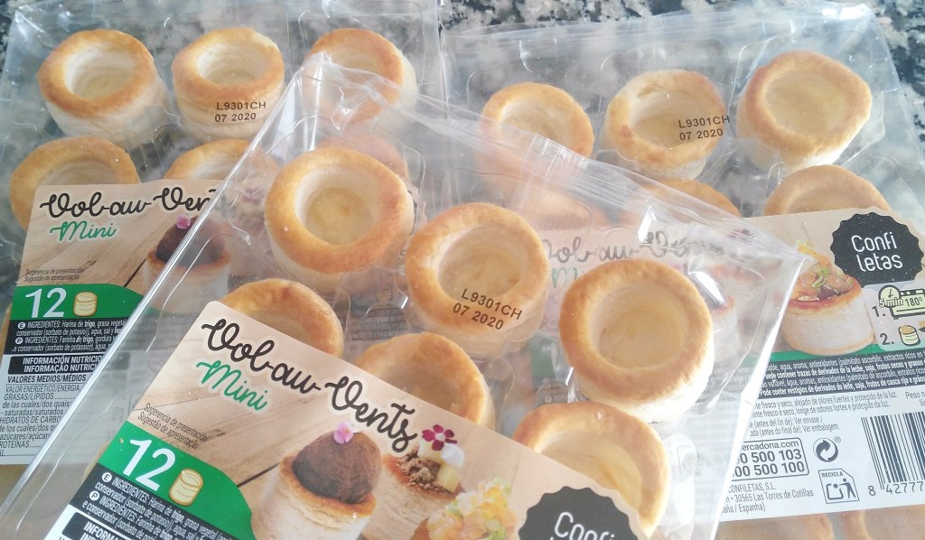 Para esta receta me he decidido por usar unos minis volovanes comprados, en lugar de hacerlos (menos trabajo). Van en paquetes de 12. Yo he hecho 36 y me ha sobrado un poco de crema.