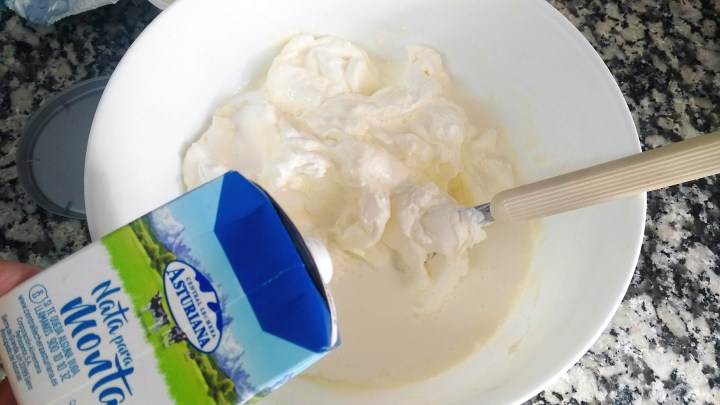En un bol añadimos el queso crema a temperatura ambiente, la nata de montar, el azúcar y la sal.