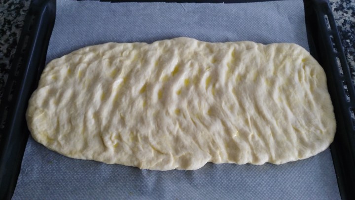 Cuando ha doblado el volumen, le ponemos aceite por encima y la aplanamos dándole la forma ovalada.