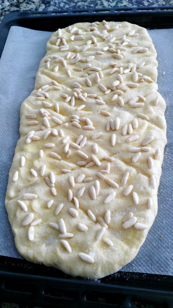 La dejamos fermentar nuevamente unos 20 minutos y le hacemos unas endiduras con la mano. Le añadimos los piñones (previamente los he tenido en remojo unos minutos para que no se quemen) y el azúcar generosamente por encima .