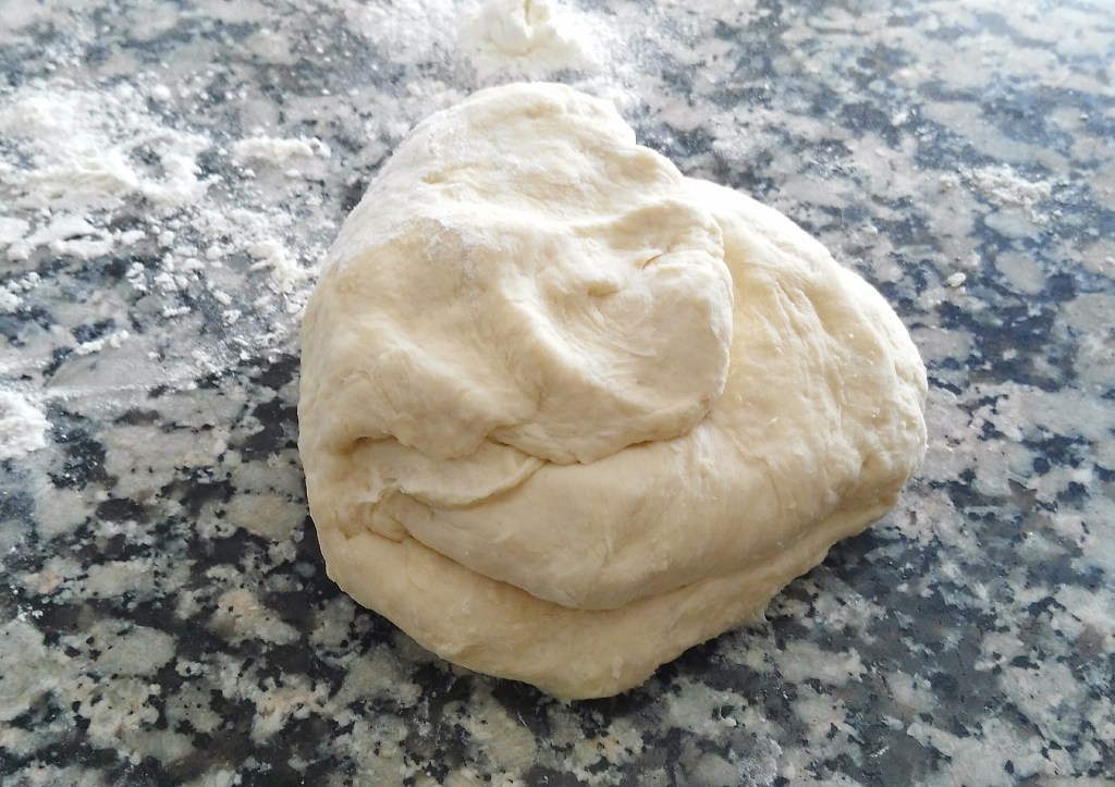 Pasado este tiempo de reposo, la masa ha cogido otra textura, ya que ha empezado a fermentar. Seguimos amasando. Damos dobleces y estiramos la masa sobre la mesa de trabajo (mármol de la cocina). Hacemos esto hasta lograr una buena elasticidad. Formaremos de nuevo una bola y la dejaremos tapada con un paño hasta que doble el volumen (una hora aprox.).