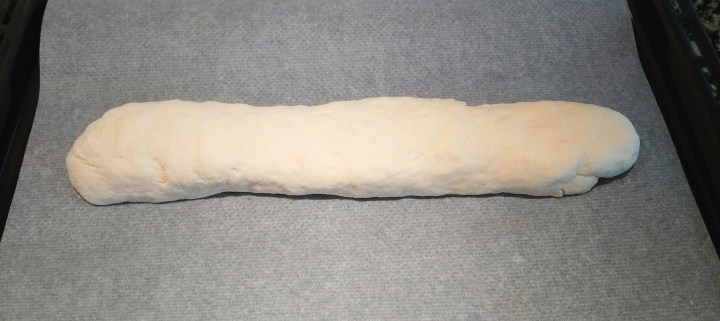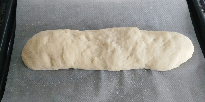 Transcurrido este tiempo y veamos que ha aumentado la bola su volumen, formamos una barra. La depositamos en una bandeja de horno con papel de hornear. Dejaremos fermentar en un sitio cerrado y que no le dé el aire ( dentro del horno apagado, por ejemplo).