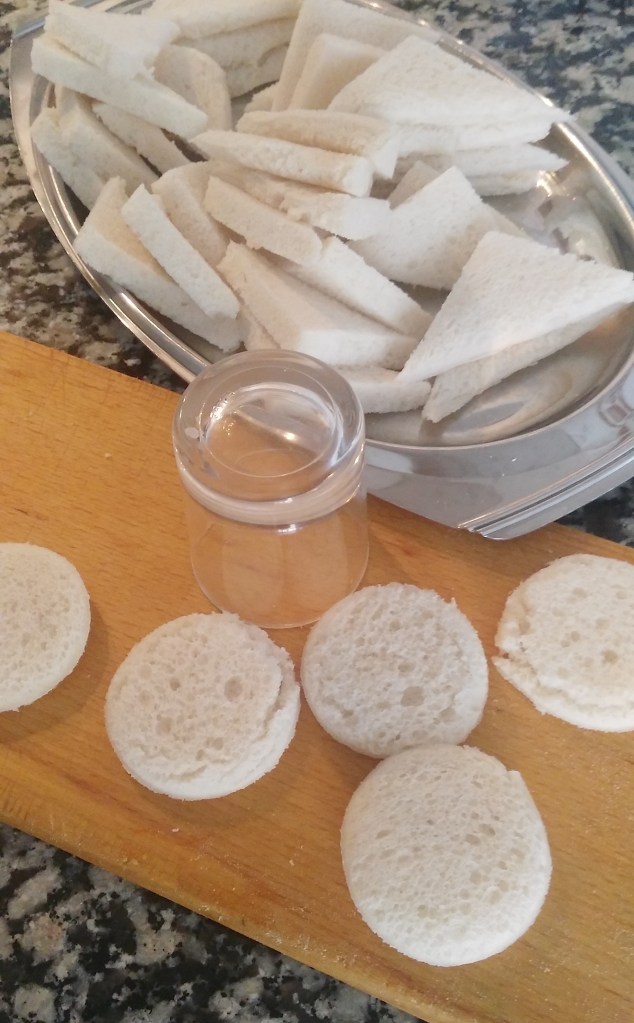 Para empezar cortaremos el pan de molde en triángulos y círculos. Para hacer los círculos he hecho servir un vasito pequeño. Tostamos el pan ligeramente.