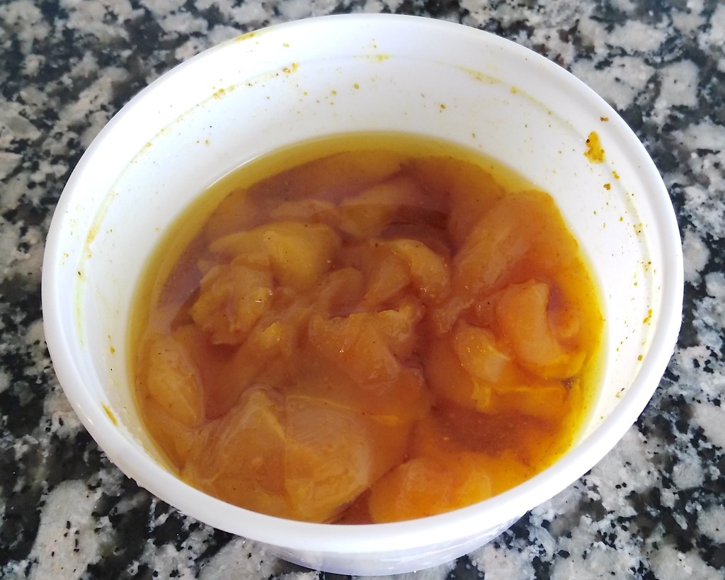 Un día antes, lamina la pechuga de pollo en trozos no muy grandes y salamos. Deshacemos una cucharadita de postre de curry en unos 50 cl de aceite y ponemos a macerar el pollo. Guardamos en el frigorífico hasta hacerlos servir.