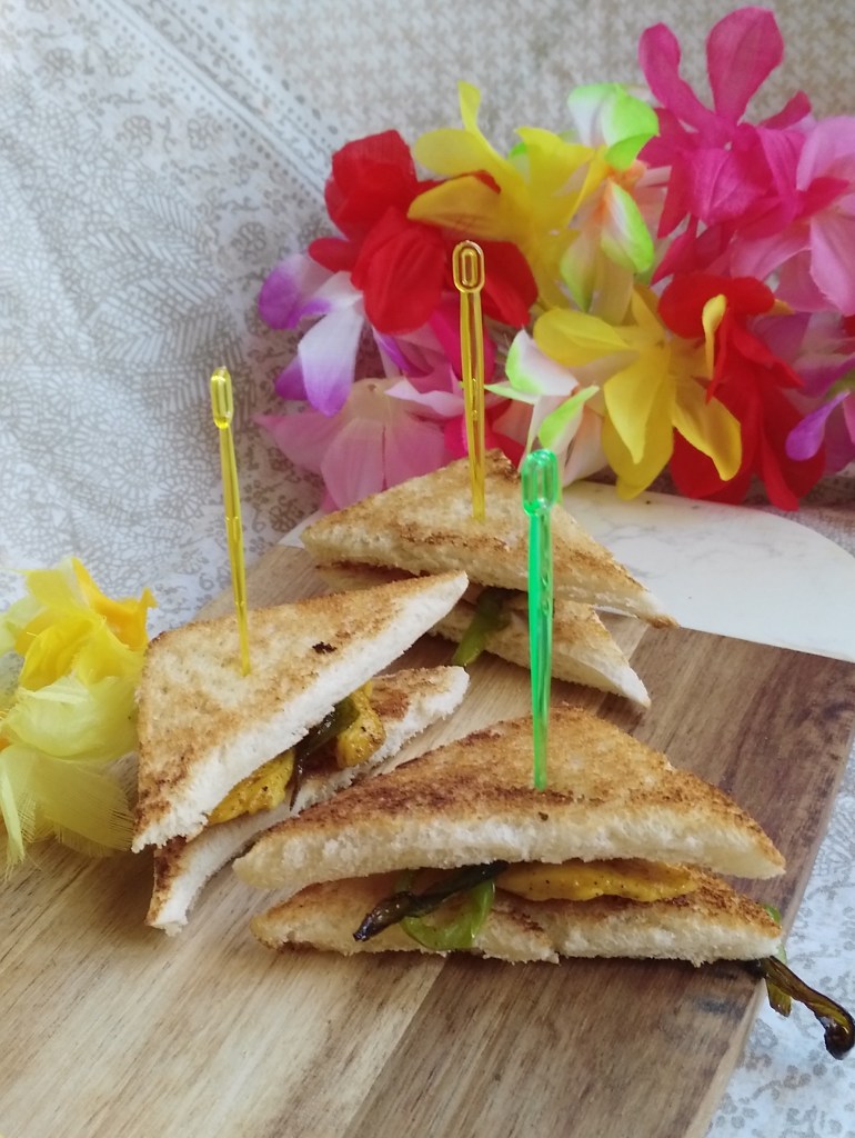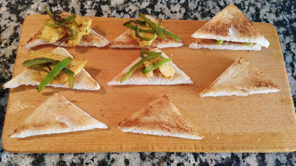 Freimos los trocitos de pollo marinado en pollo y ya podemos montar los sándwiches añadiendo un poco de pimiento verde frito.