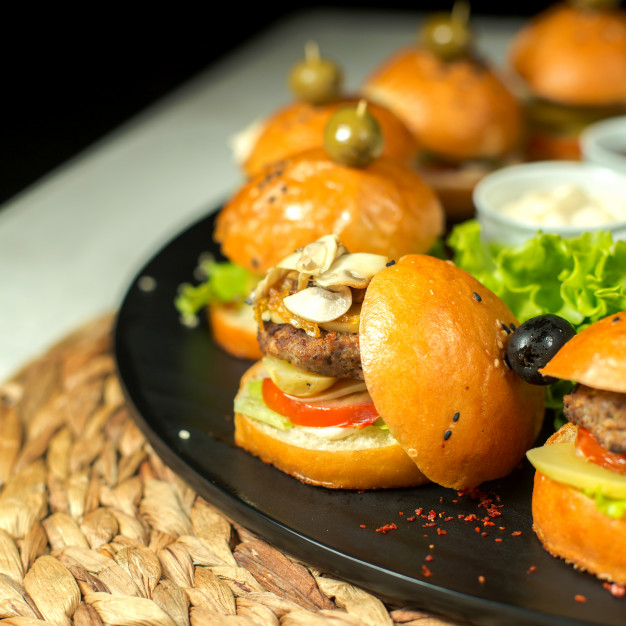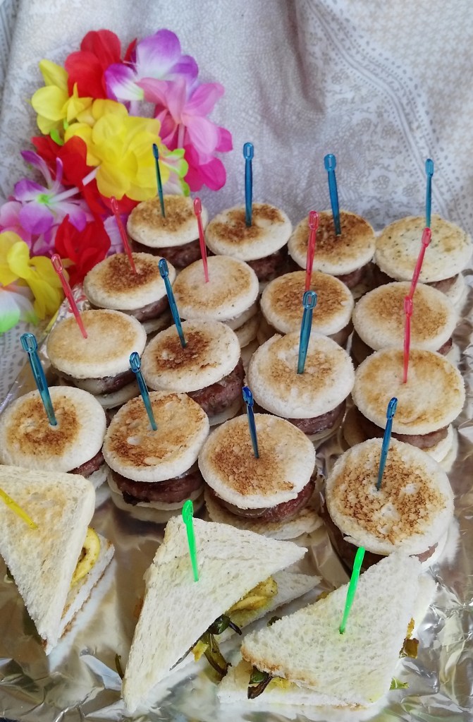 Y así quedan montados los mini bocadillos de hamburguesas con cebolla caramelizada y queso.