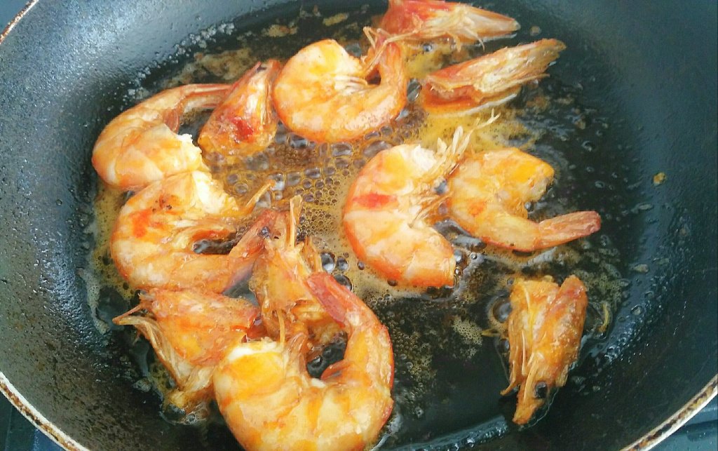 Empezamos friendo ligeramente en un poco de aceite los langostinos. No necesitan una cocción larga.