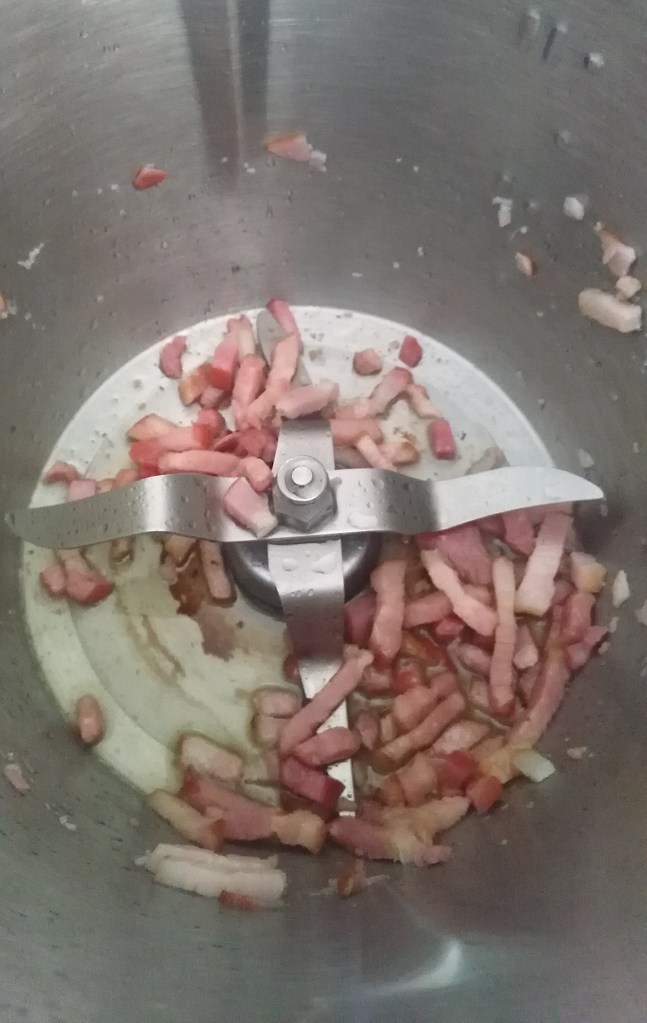 Empieza rehogando 5 minutos el beicon en un poco de aceite, sin el cubilete. Si ves que no estan doraditos puedes darle un par de minutos más. Retirar y reservar.