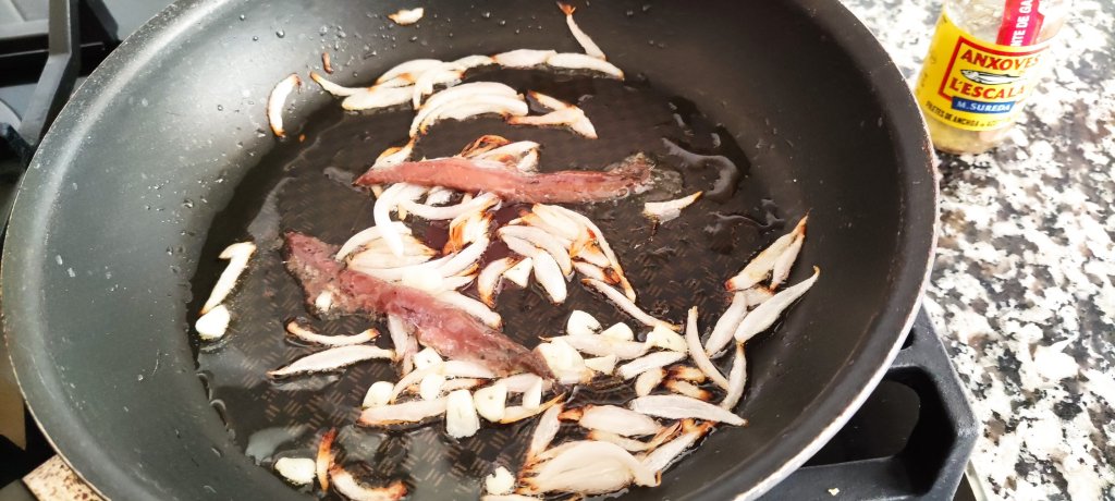 En una sartén fríe la cebolla laminada y el ajo picado en un poco de aceite a fuego suave. Añade dos anchoas y remueve.