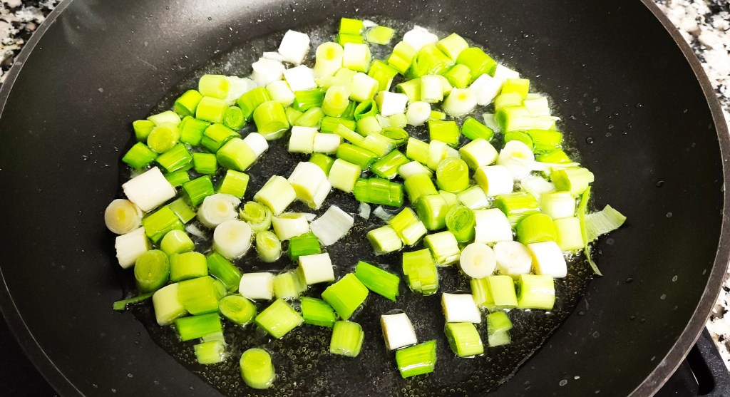 Limpiamos y troceamos los ajos tiernos. En una sartén con un poco de aceite los sofreimos a fuego suave.