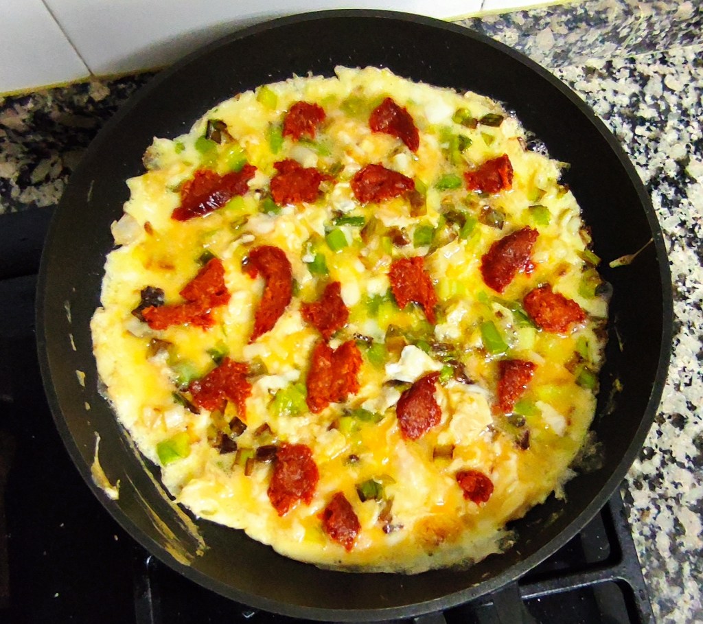 Troceamos la sobrasada y repartimos por encima del huevo. Es importante hacerla con el fuego suave para que vaya cuajando la tortilla.