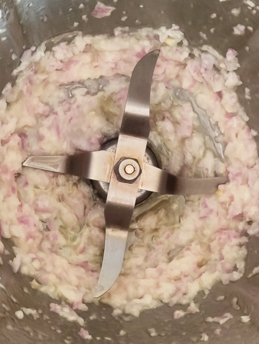 Empieza pesando 70gr de cebolla y 50gr de aceite en el recipiente del robot.