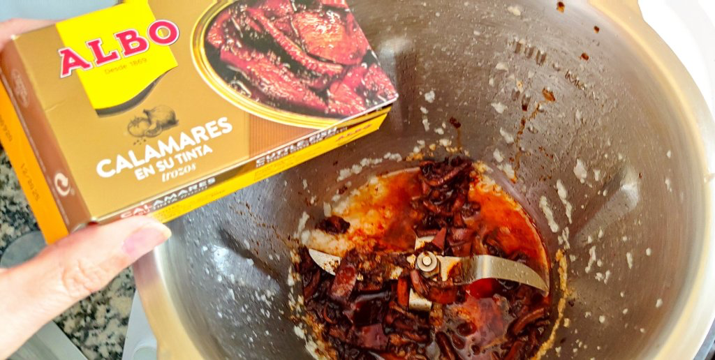 Añade la lata de calamares en su tinta y rehogar 2 minutos, 120º . Siempre marcha atrás y sin el medidor.