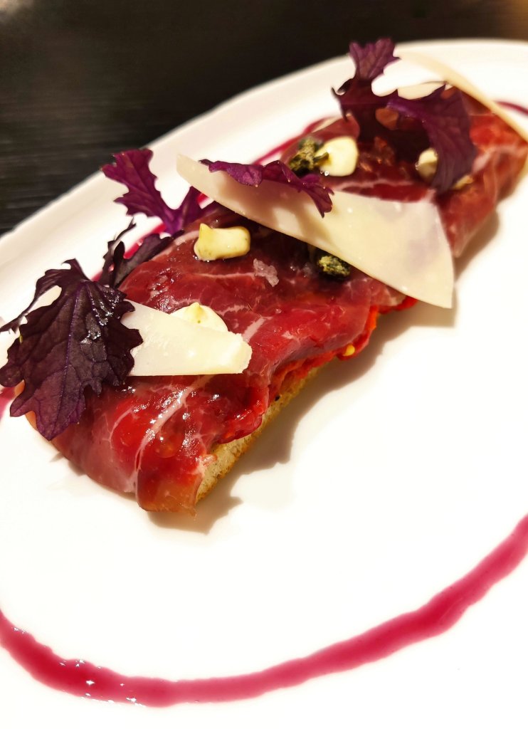 Sorbete de frambuesas, espuma de remolacha y aceituna negra garrapiñada