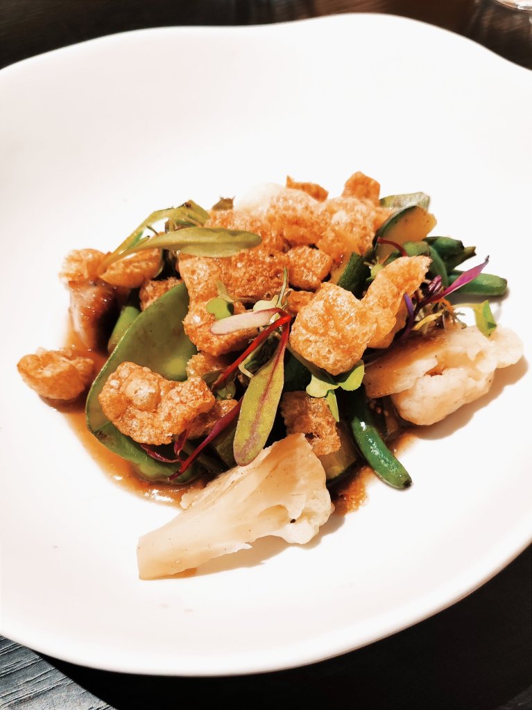 Papillote de verduras de temporada con cortezas de cerdo y vinagreta