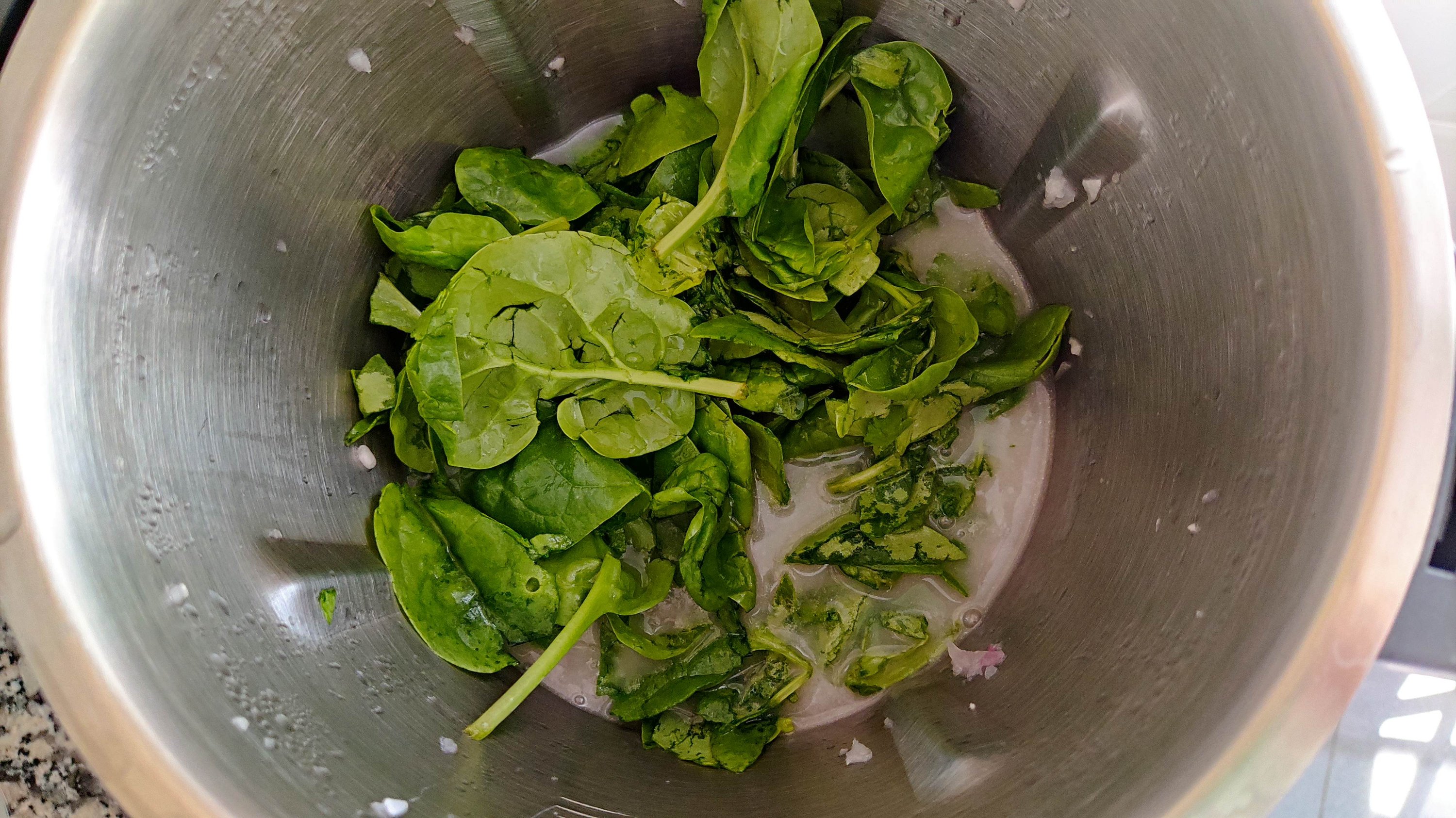 Transcurrido este tiempo incorporaremos la bolsita de espinacas baby (puedes poner menos cantidad) y dejaremos cocer 4 minutos más marcha atrás a 110º.