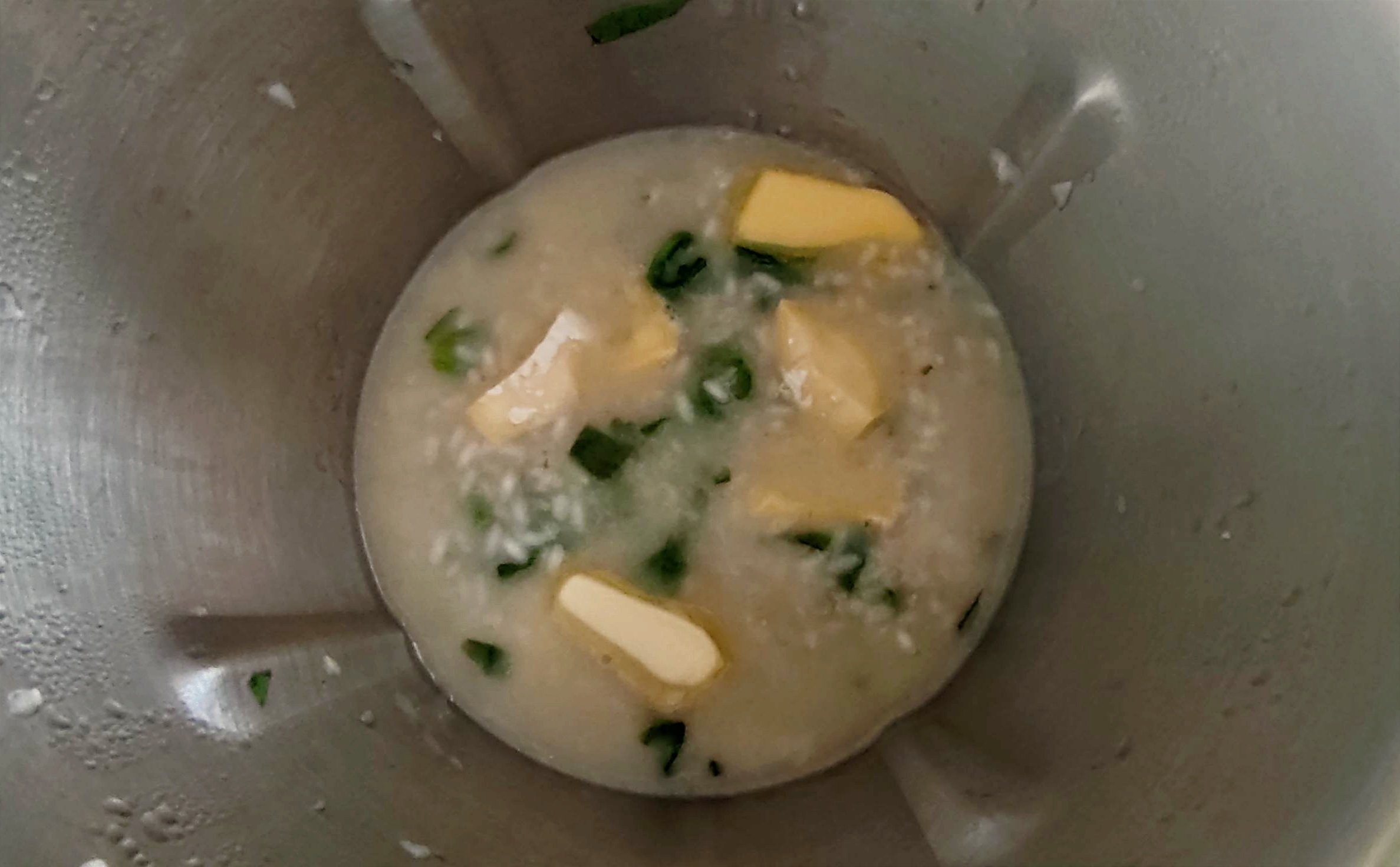 A continuación incorporamos dos cucharitas de mantequilla y los 50 gr de queso azul a trozos. Cocemos 2 o 3 minutos marcha atrás a 110º y dejamos reposar un par de minutos antes de servir.
