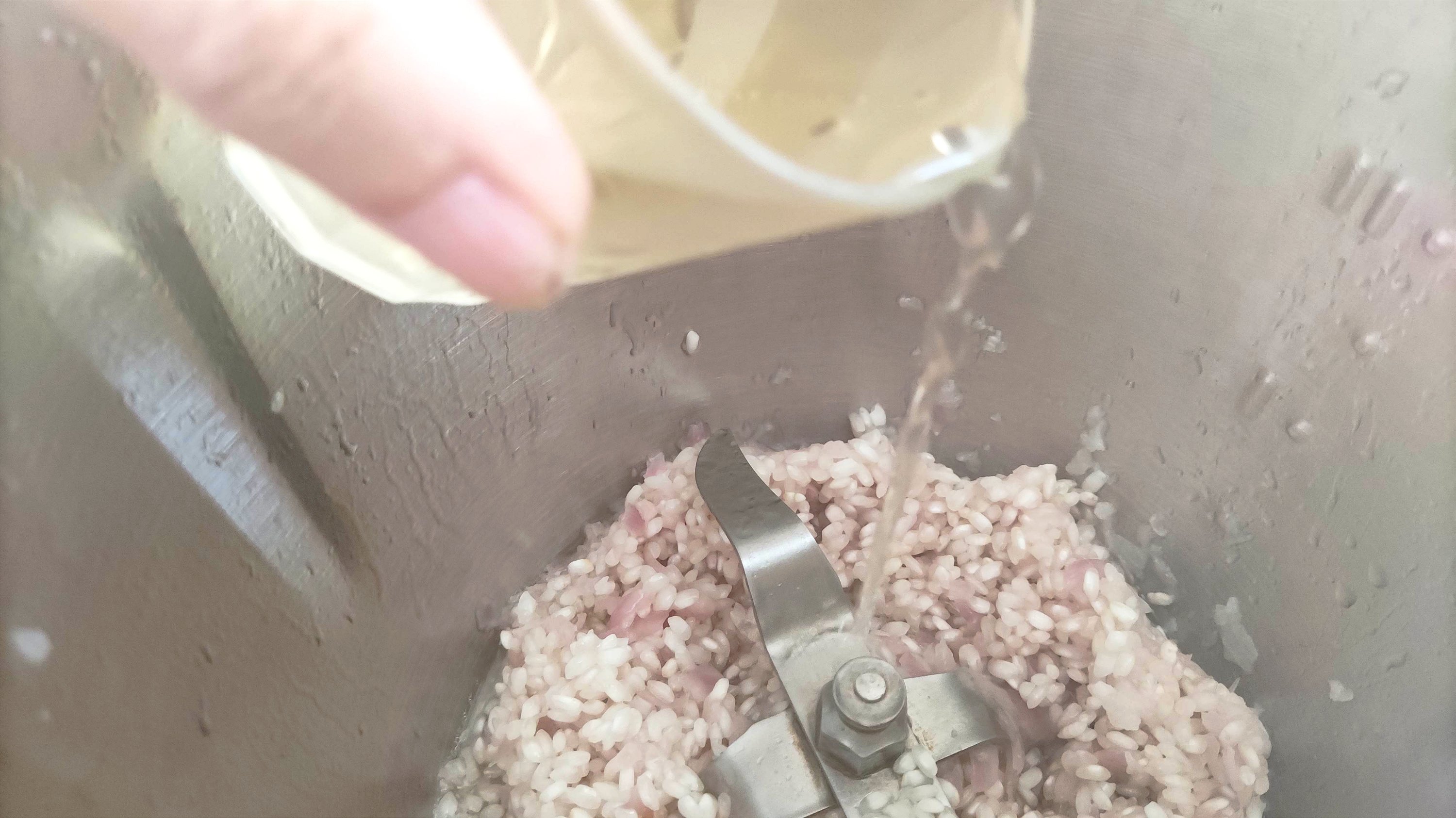 Añadimos el vasito de vino blanco y rehogamos 2 minutos más a 110º sin medidor.