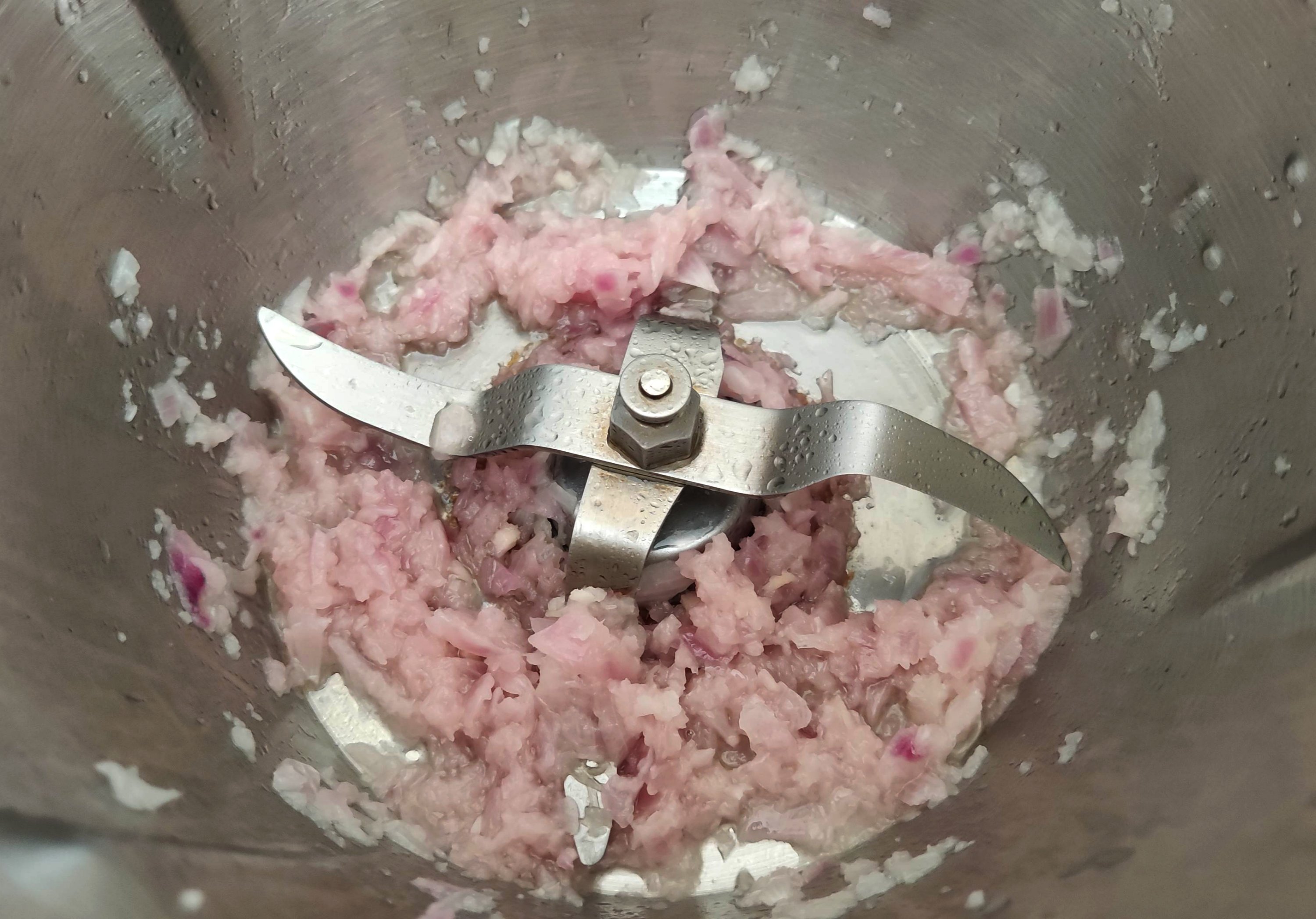 Ponemos en el robot la cebolla y pesamos. Iremos pesando los ingredientes conforme vayamos incorporando. De todas maneras yo muchas veces las cantidades son un poco a ojo, tu mism@ iras viendo y aprendiendo las cantidades que necesitas.